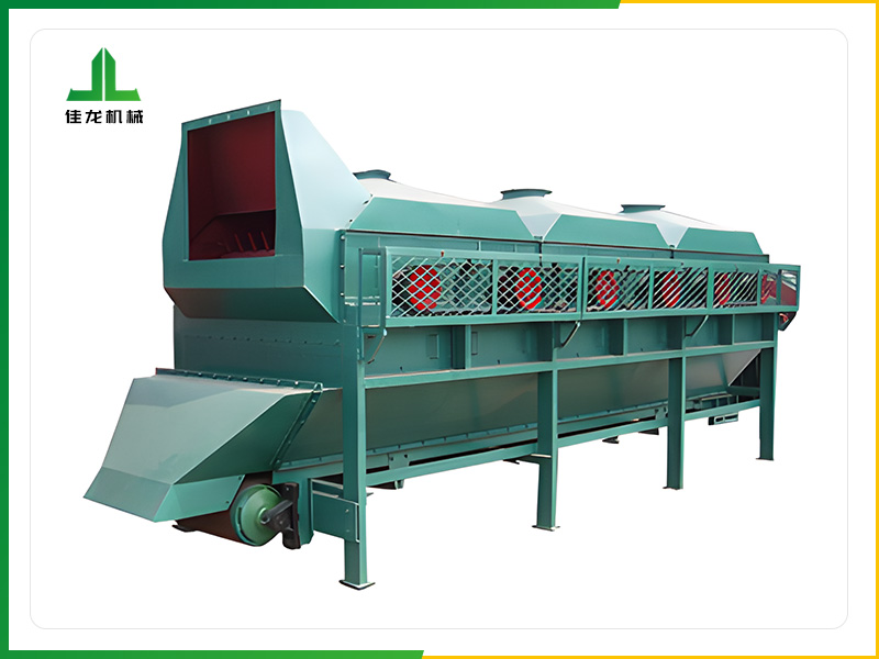 輥式除塵機又稱羊角篩,它往往多臺串聯使用。其轉鼓上固定有錐形短棒。轉動時把弧形篩板上的草片打散翻動,并使重物如沙塵、谷料等通過篩板落下。